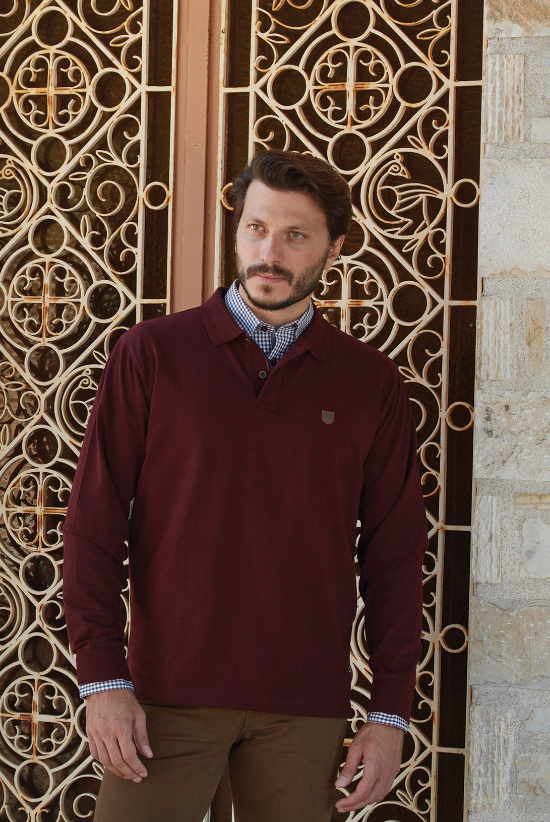 Βαμβακερή μπλούζα πολο με μακρύ μανίκι σε κανονική προς φαρδιά γραμμή της εταιρείας Visconti.Διαθέσιμα χρώματα, μπλε ανοιχτό co.8,καμελ co.6 ,μπορντό co.2 , μαύρο co.5 ,κυπαρισι co. 10