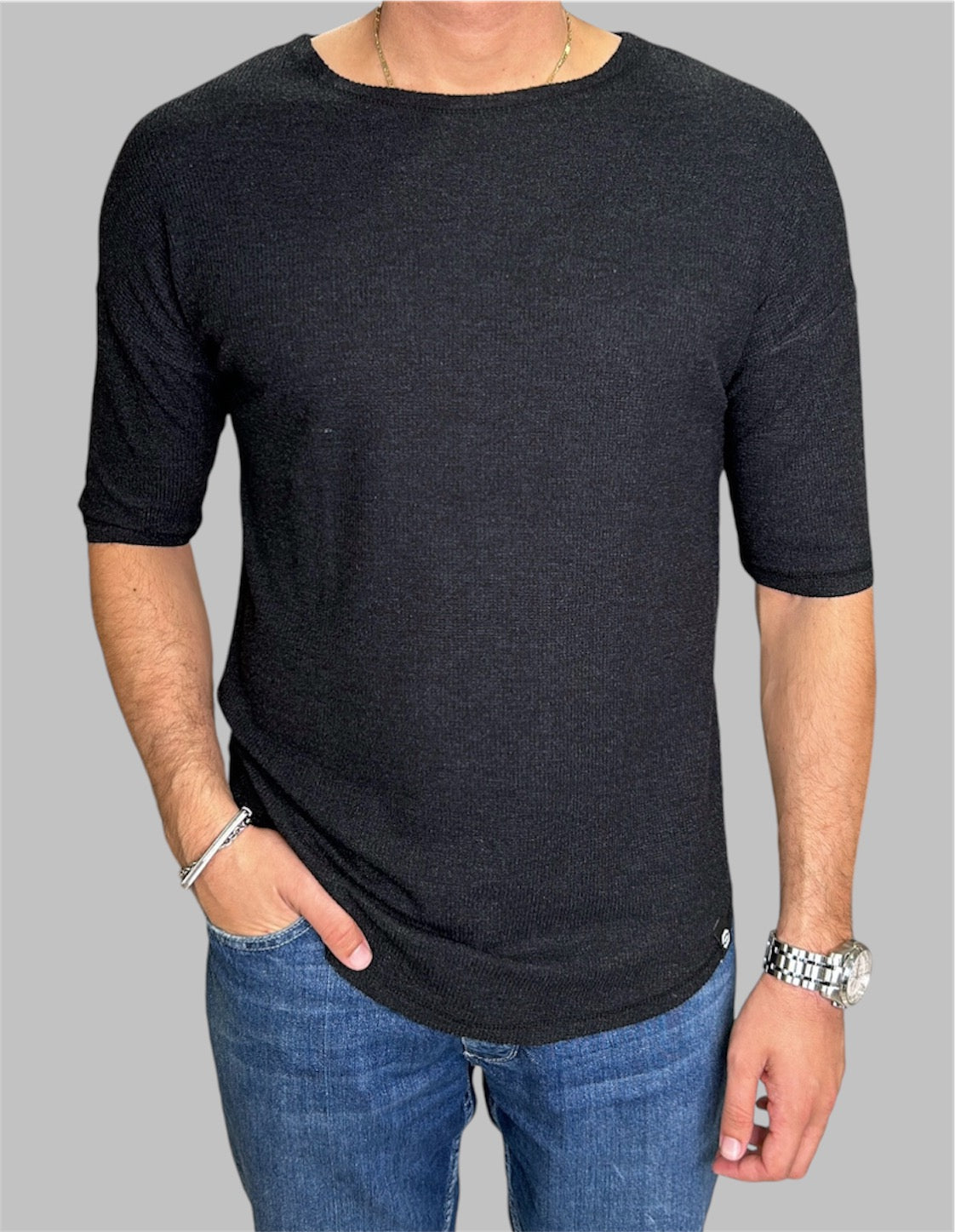 Γκρι ζαπονε μπλουζα με μανίκι μέχρι τον αγκώνα και ανοιχτό λαιμό σε κανονική γραμμή.