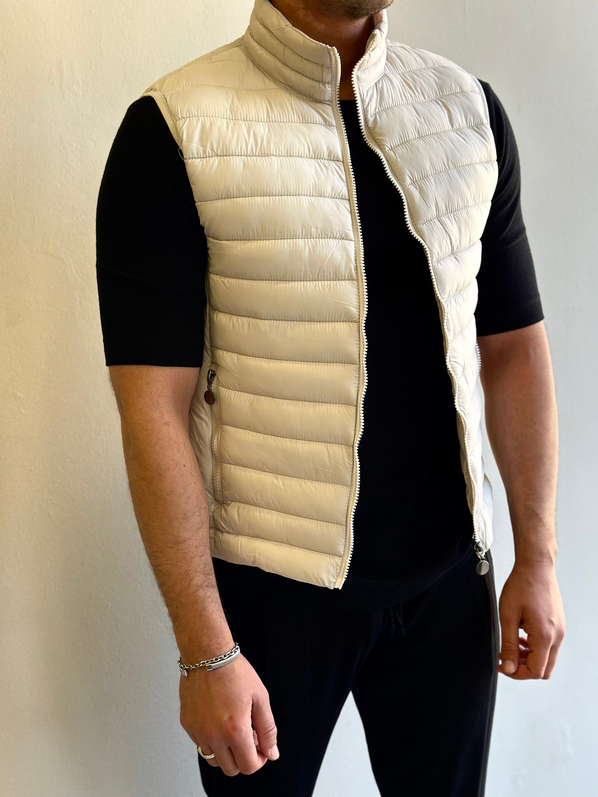 Αμάνικο μπουφάν σε εκρού χρώμα σε στενή γραμμή.