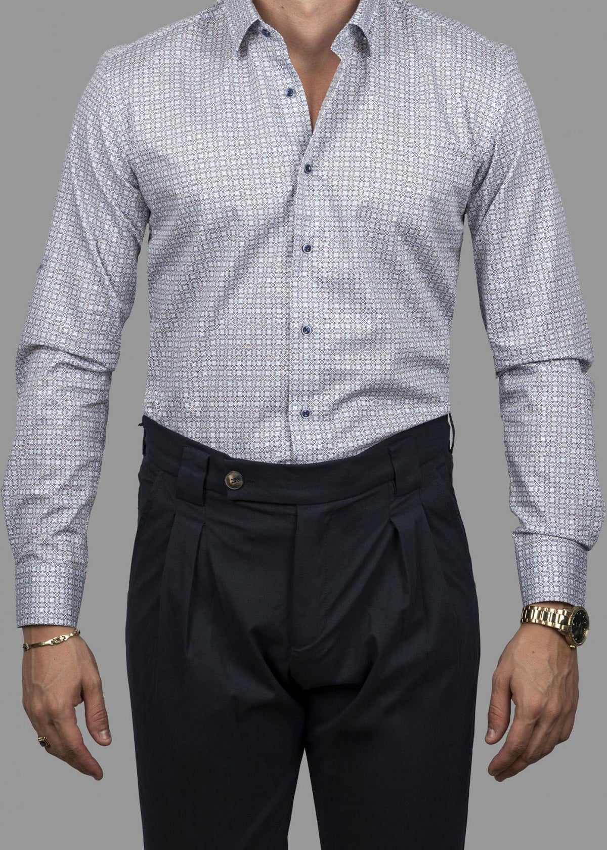 Λευκό πουκάμισο με πολύχρωμο μικροσχέδιο σε στενή γραμμή.
