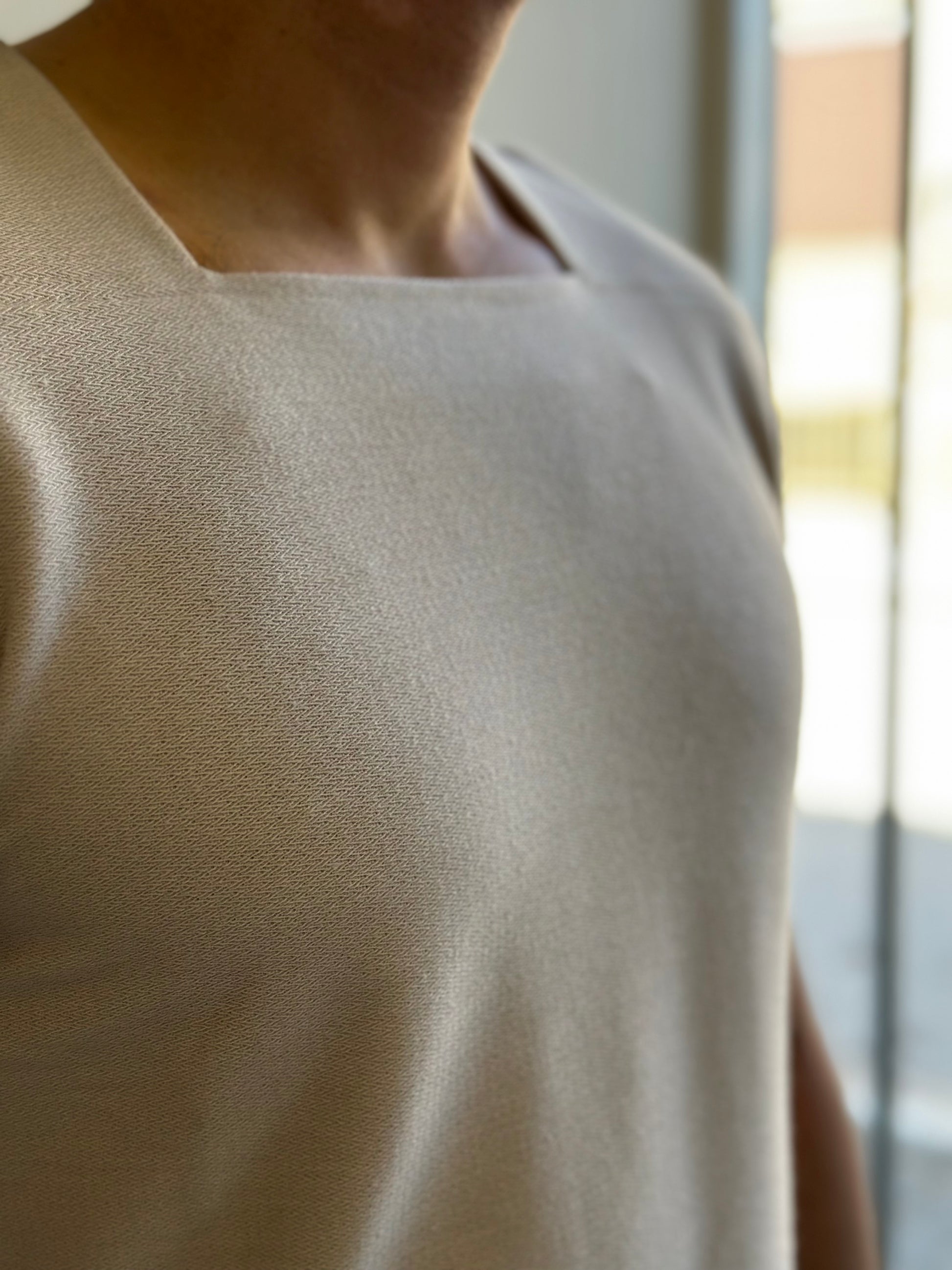 Μπεζ t-shirt με τετράγωνο λαιμό σε στενή γραμμή.