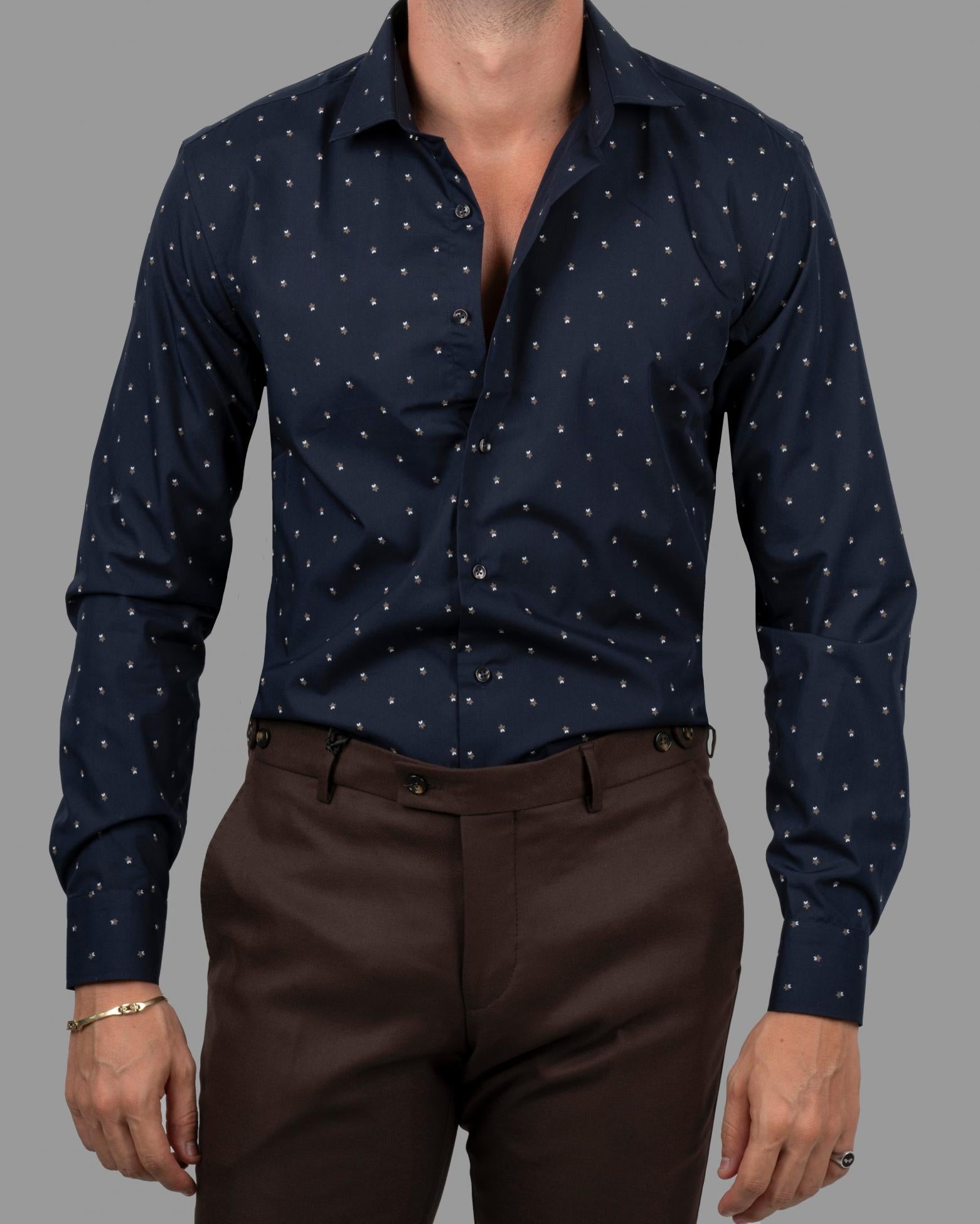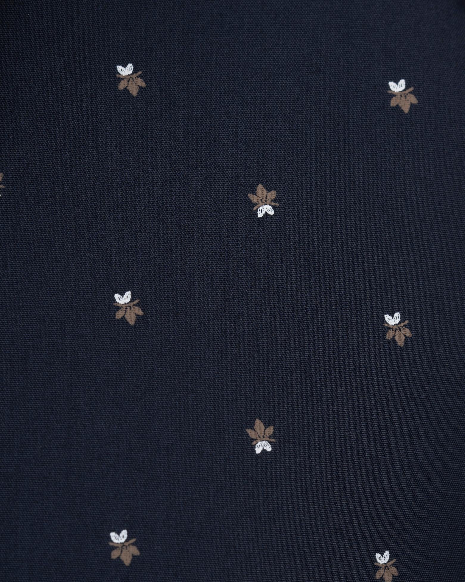 Μπλε πουκάμισο με καμελ-λευκό μικροσχέδιο σε στενή γραμμή.