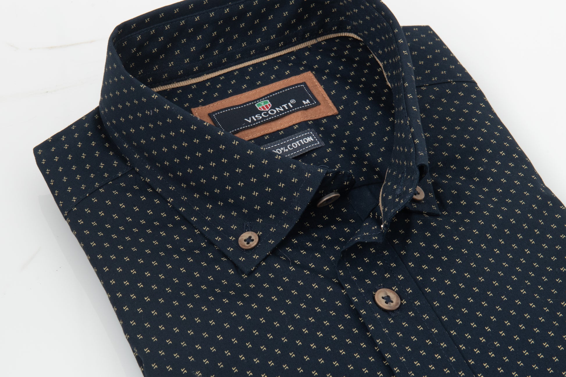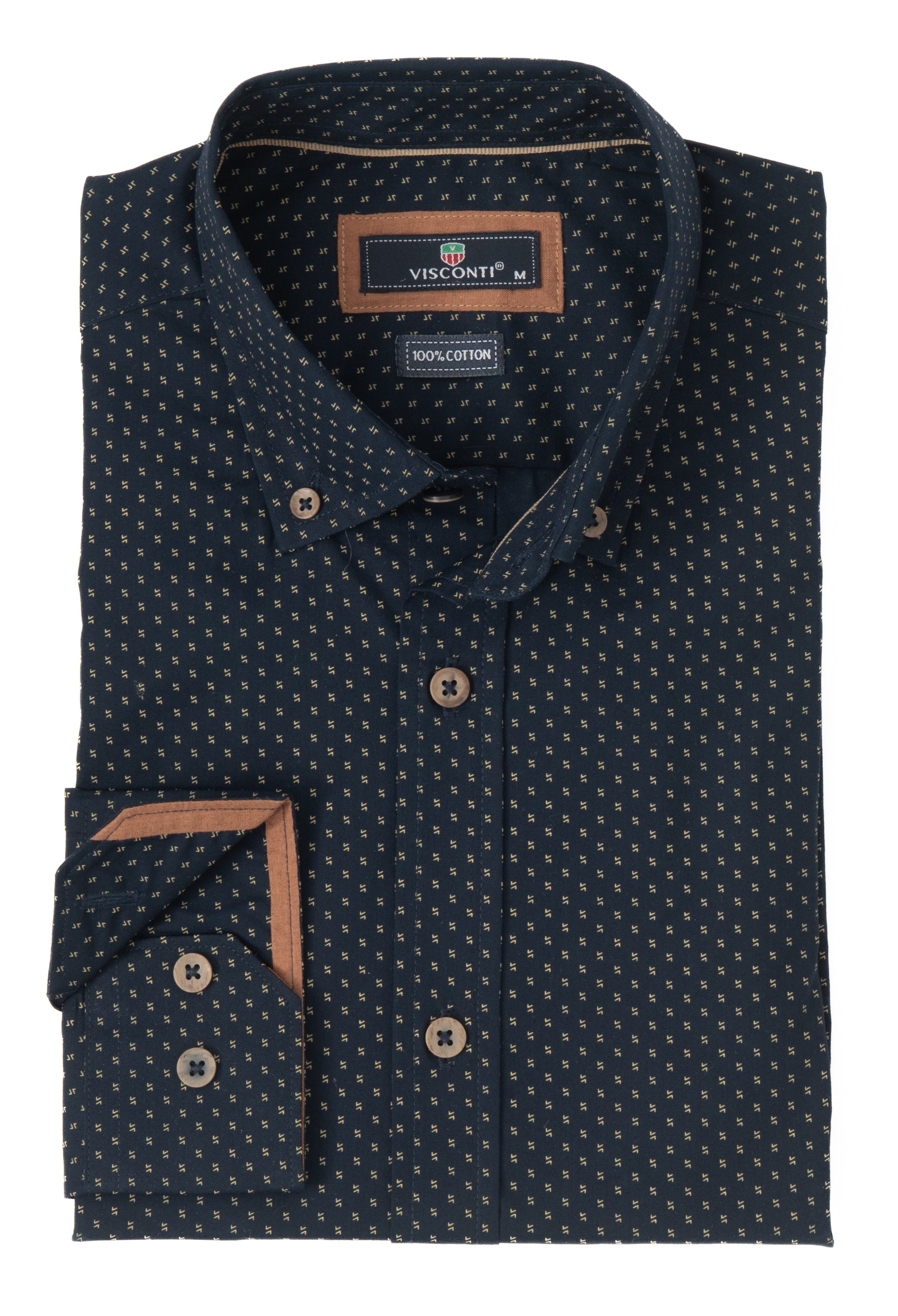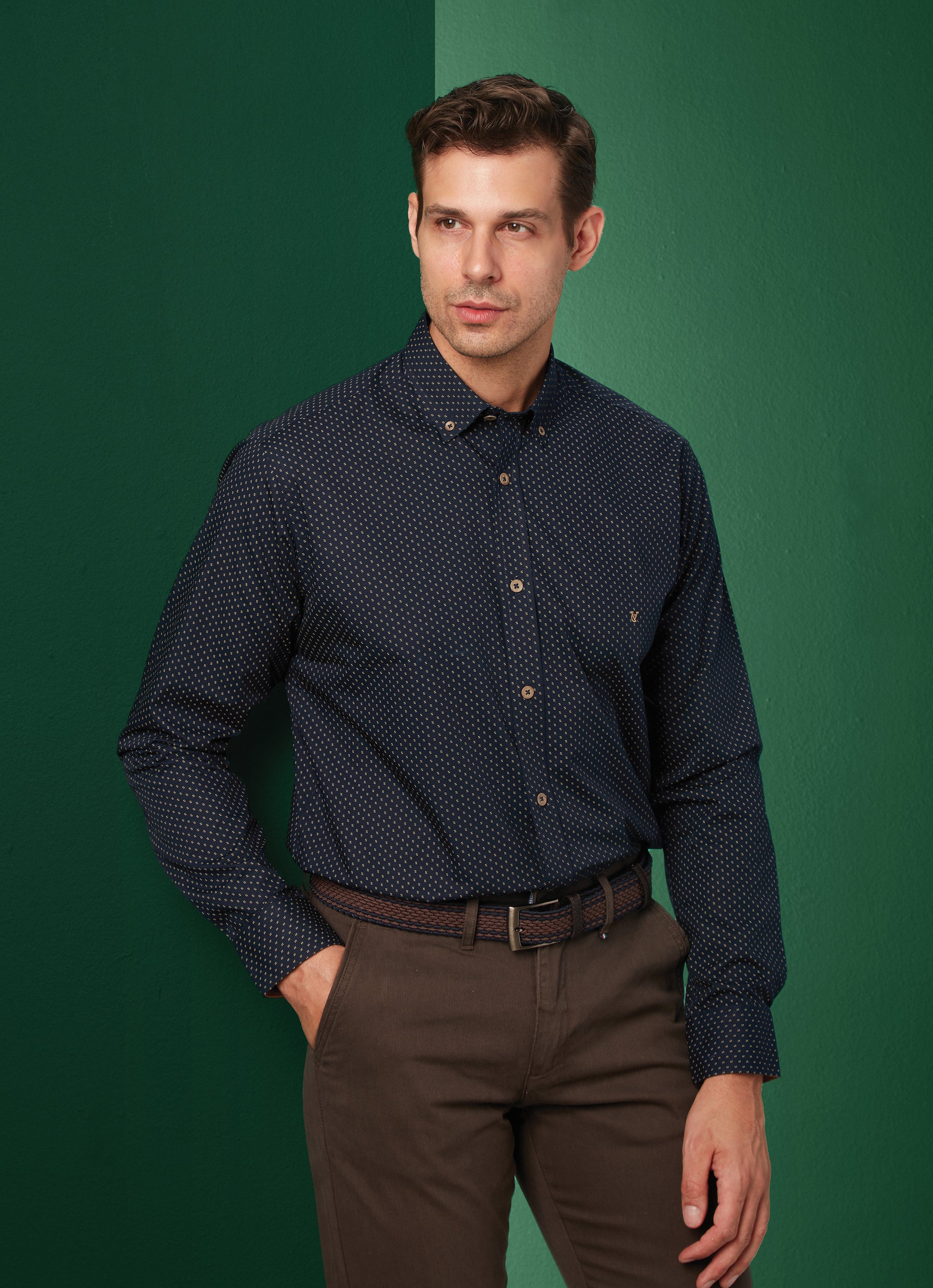 Ανδρικό πουκάμισο σε κανονική γραμμή , σκούρο μπλε χρώμα με μικροσχέδιο.