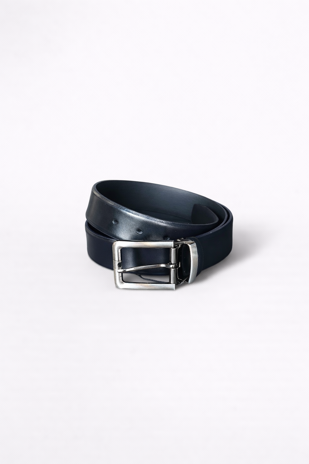 Δερμάτινη ζώνη χρώματος σκούρου μπλε με ελαφρώς γυαλιστερή επιφάνεια και gun metal αγκράφα.