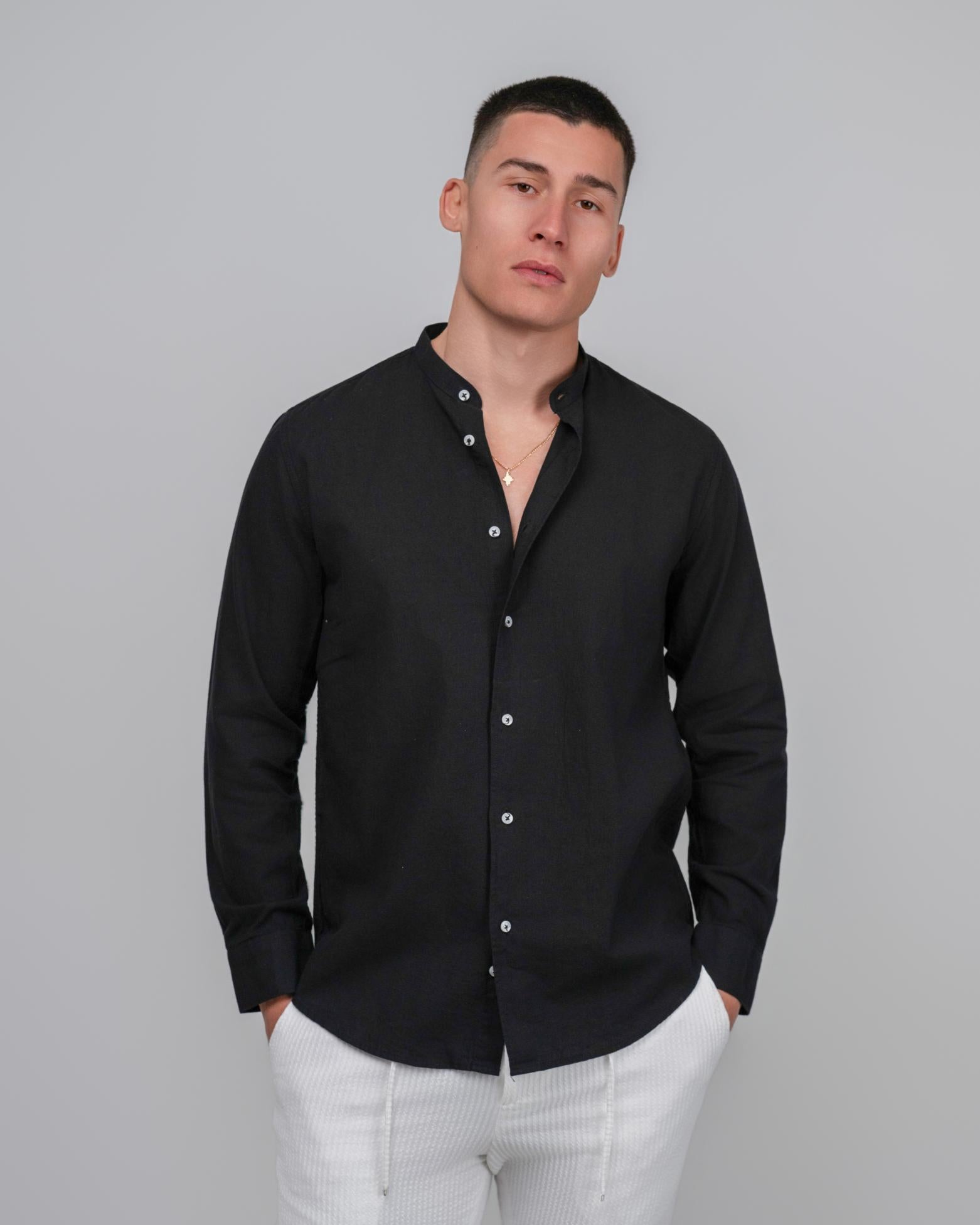 Ένα διαχρονικό ανδρικό Λινό πουκάμισο με μάο γιακά σχεδιασμένο για άνεση και καθημερινή κομψότητα.