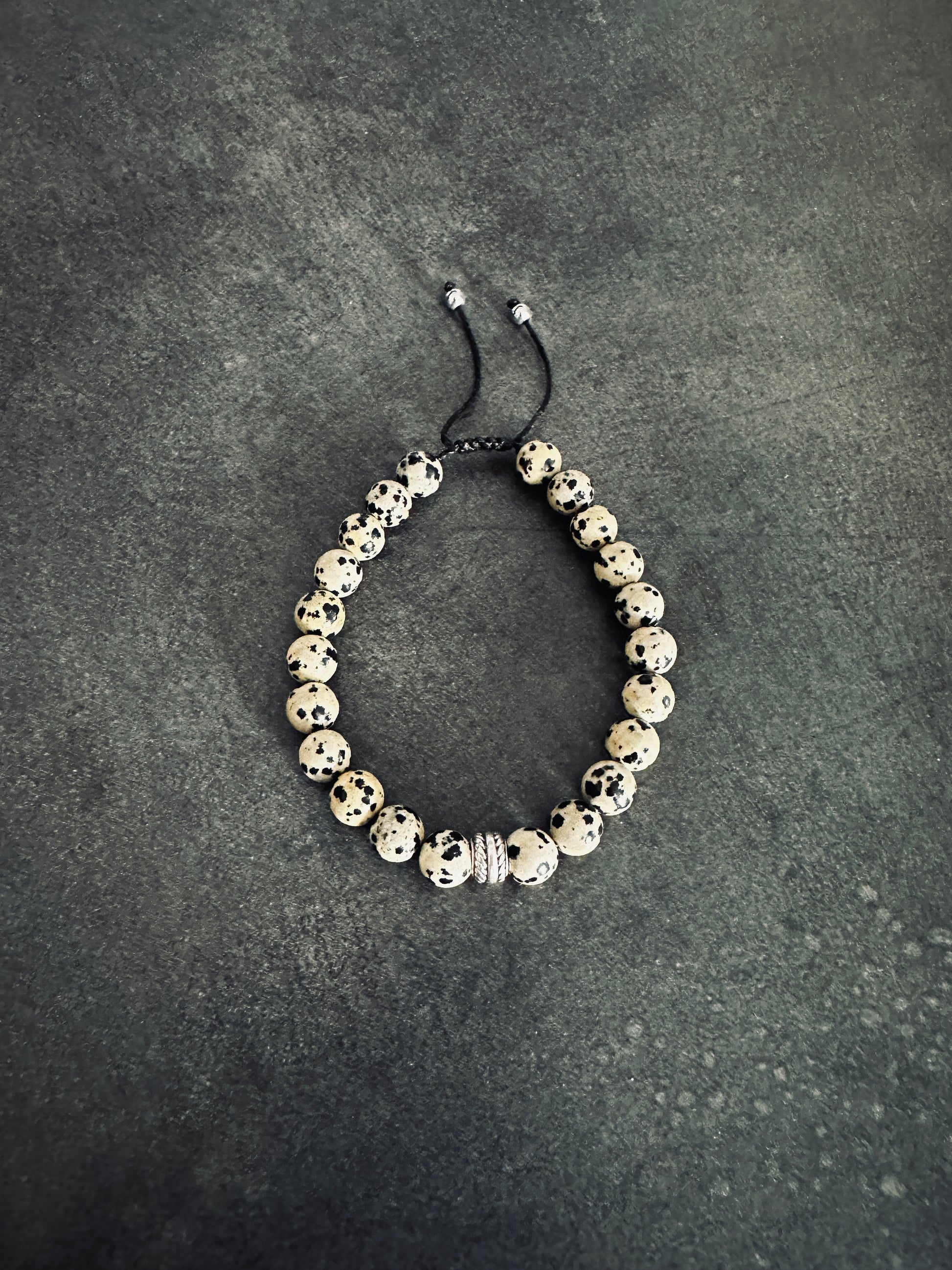 Βραχιόλι με χάντρες από ημιπολύτιμους λίθους σε μπεζ χρώμα με μαύρες λεπτομέρειες και μια ασημί χάντρα στο κέντρο.Διαθέτει κορδονάκι το οποίο προσφέρει ανθεκτικότητα και αντοχή καθώς και καλύτερη προσαρμογή ανάλογα με το χέρι σας. Κομψή επιλογή για μοναδικό στυλ.