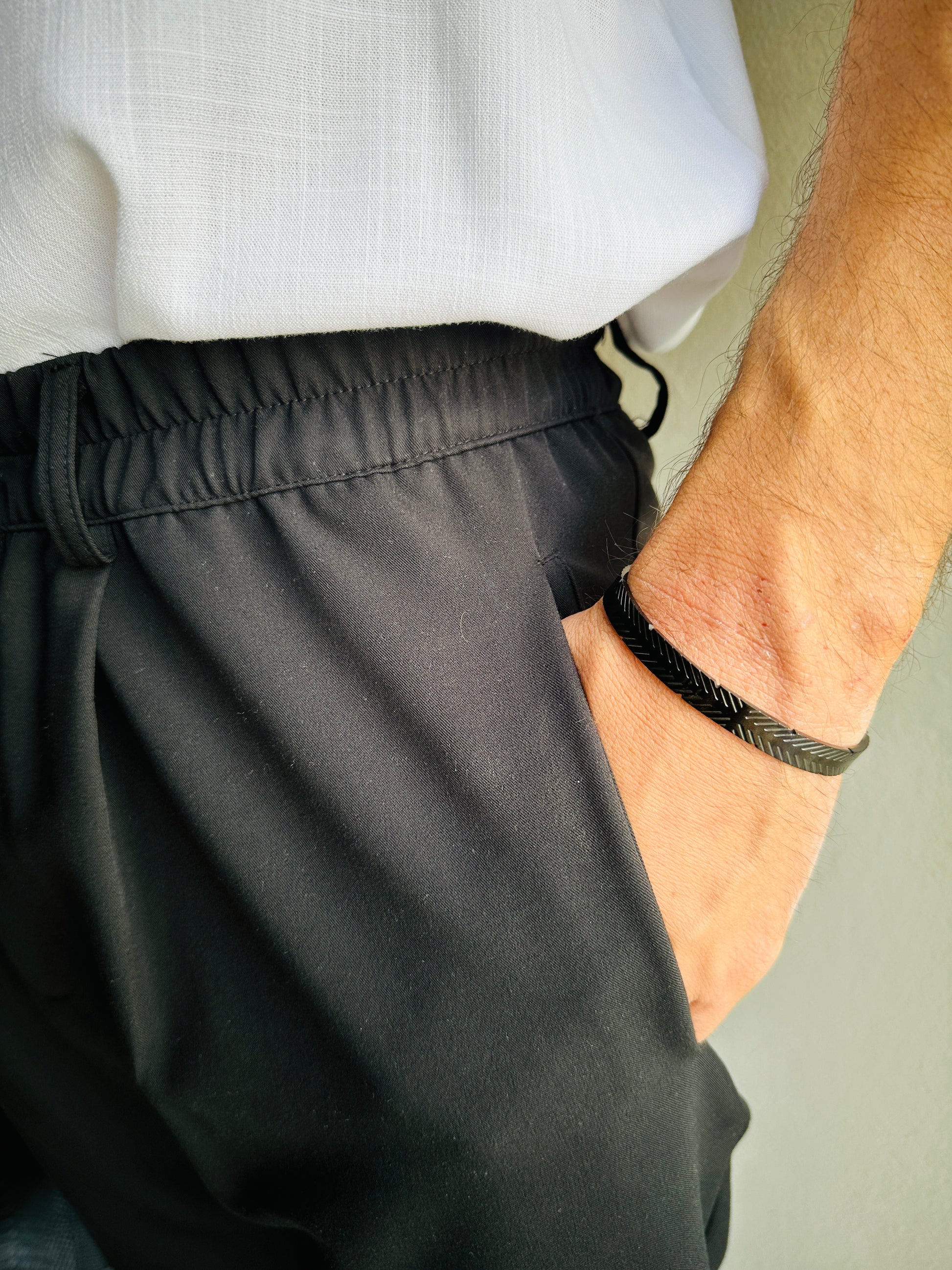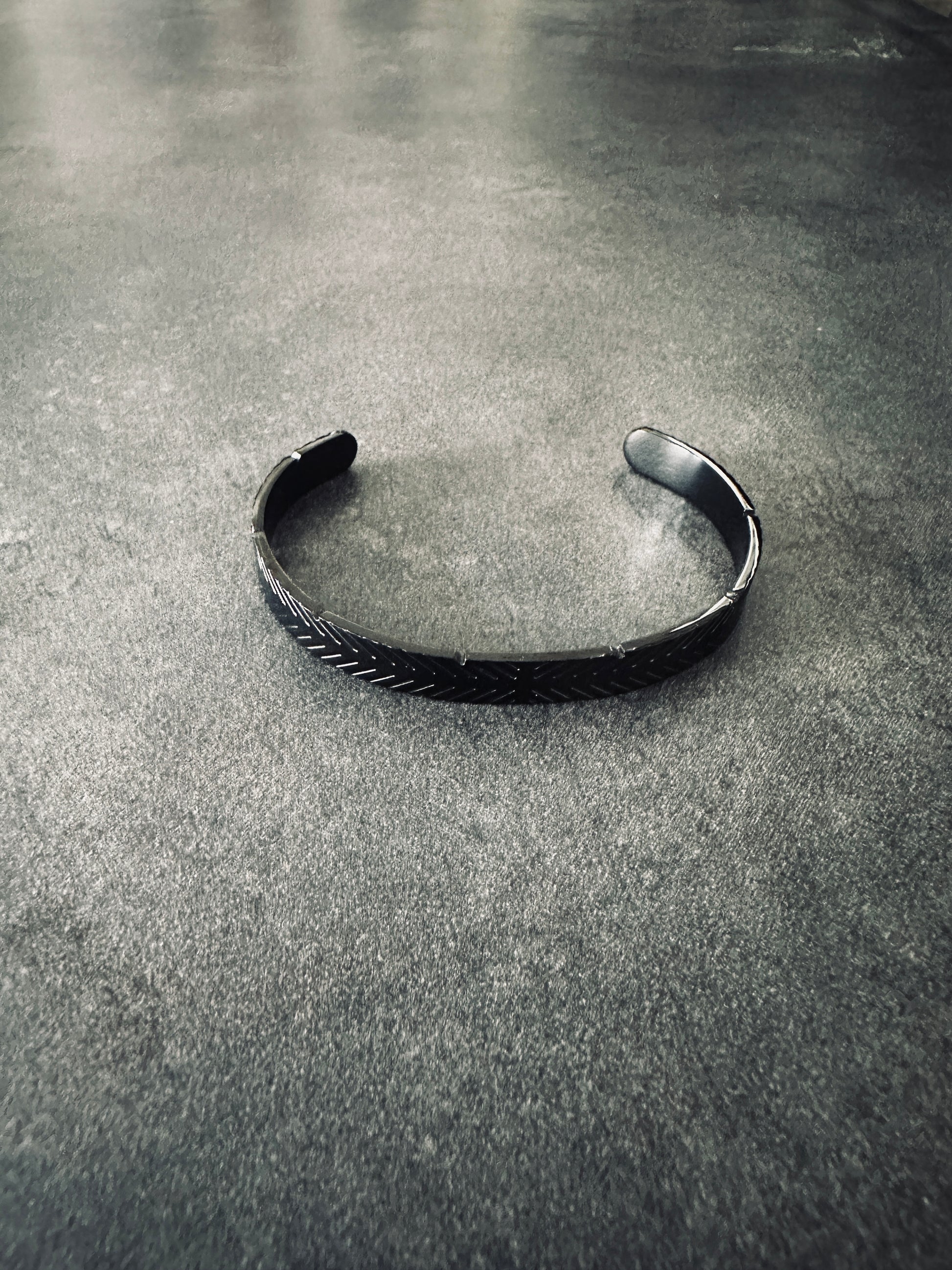 Χειροπέδα από ατσάλι σε μαύρο χρώμα με γραμμίκο σχέδιο στην επιφάνεια. Κομψό και διαχρονικό αξεσουάρ για κάθε περίσταση.