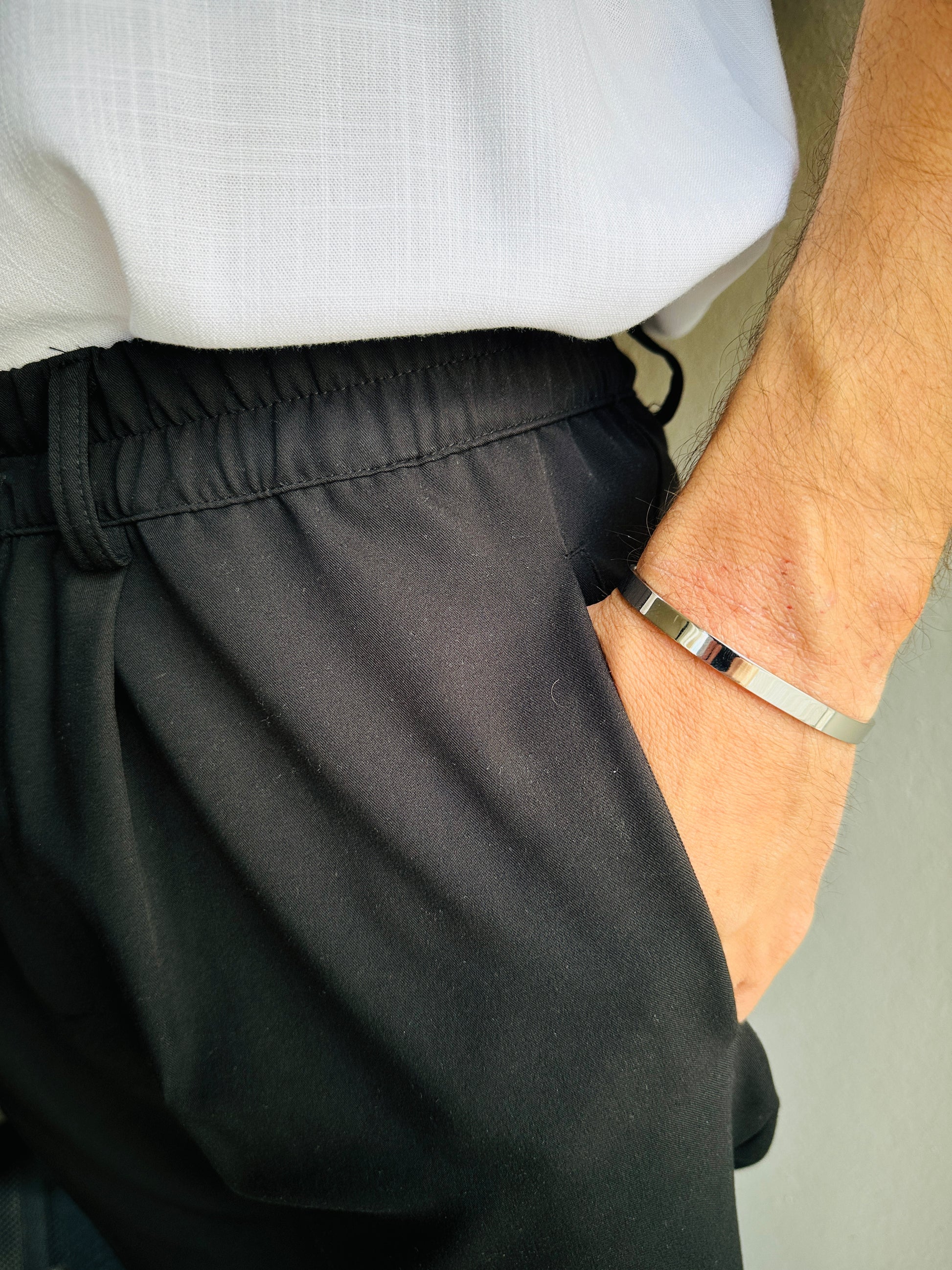 Χειροπέδα από ατσάλι σε ασημί χρώμα με γυαλιστερή επιφάνεια. Κομψό και διαχρονικό αξεσουάρ για κάθε περίσταση.