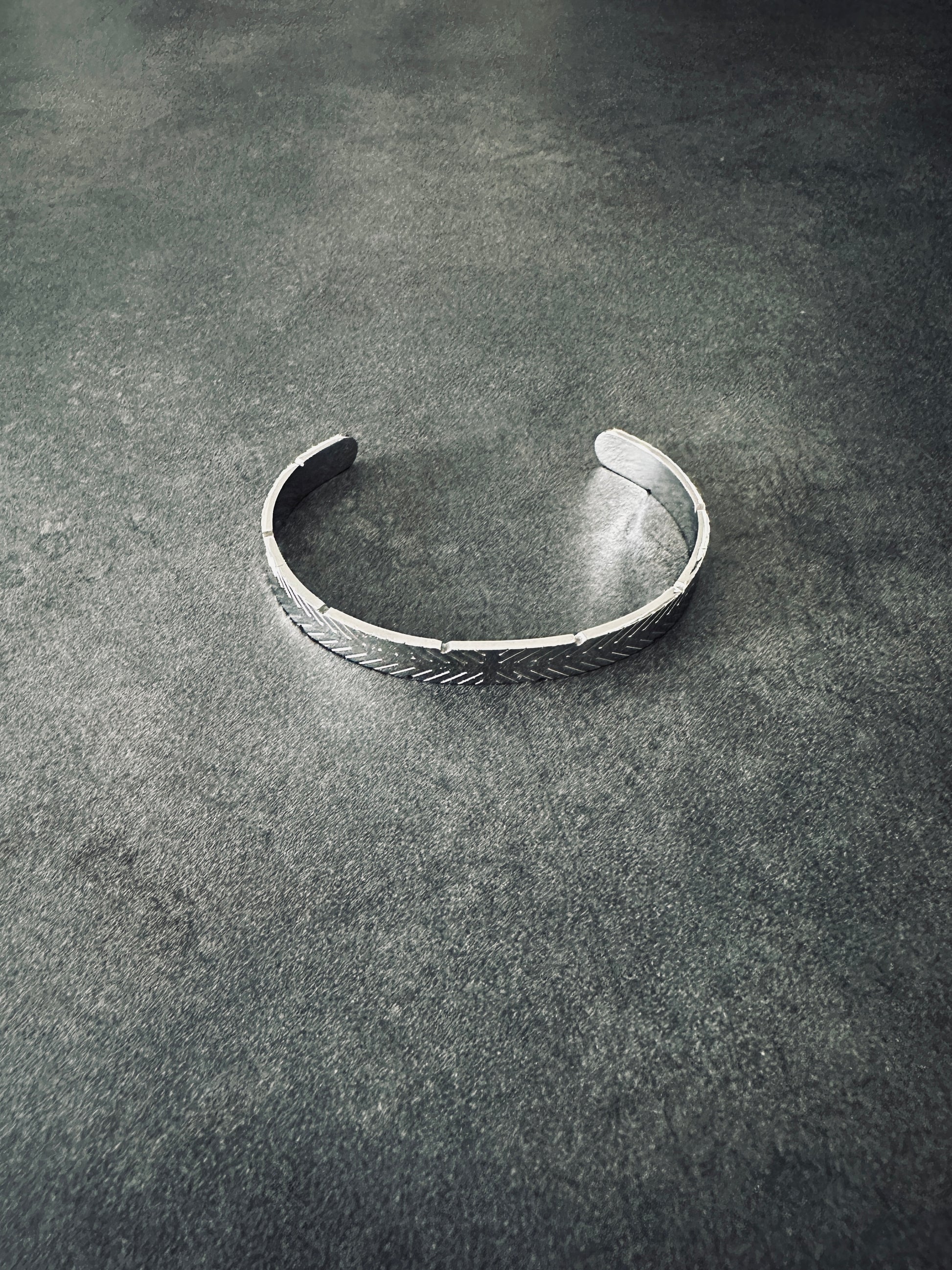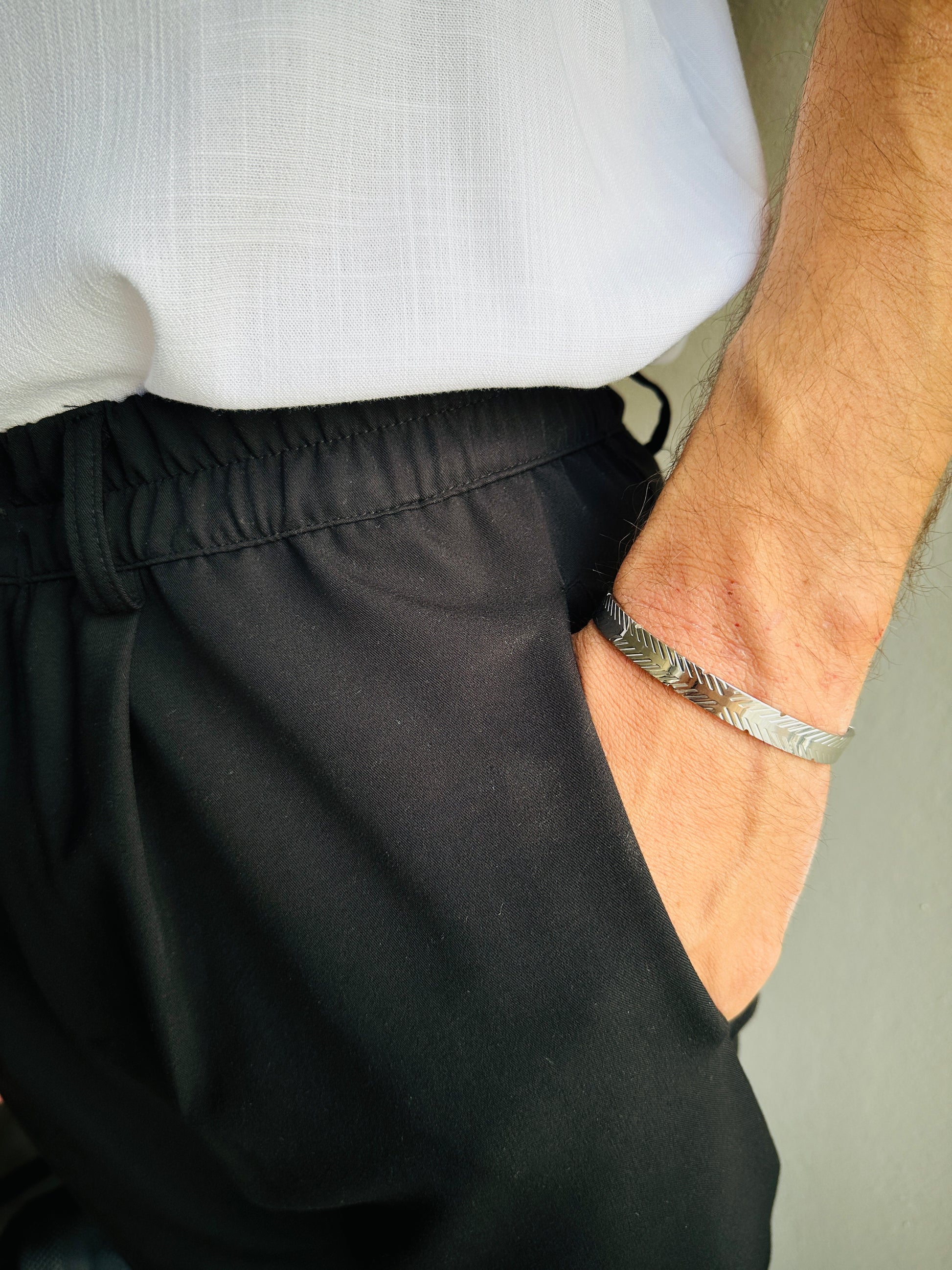 Χειροπέδα από ατσάλι σε ασημί χρώμα με γραμμίκο σχέδιο στην επιφάνεια. Κομψό και διαχρονικό αξεσουάρ για κάθε περίσταση.