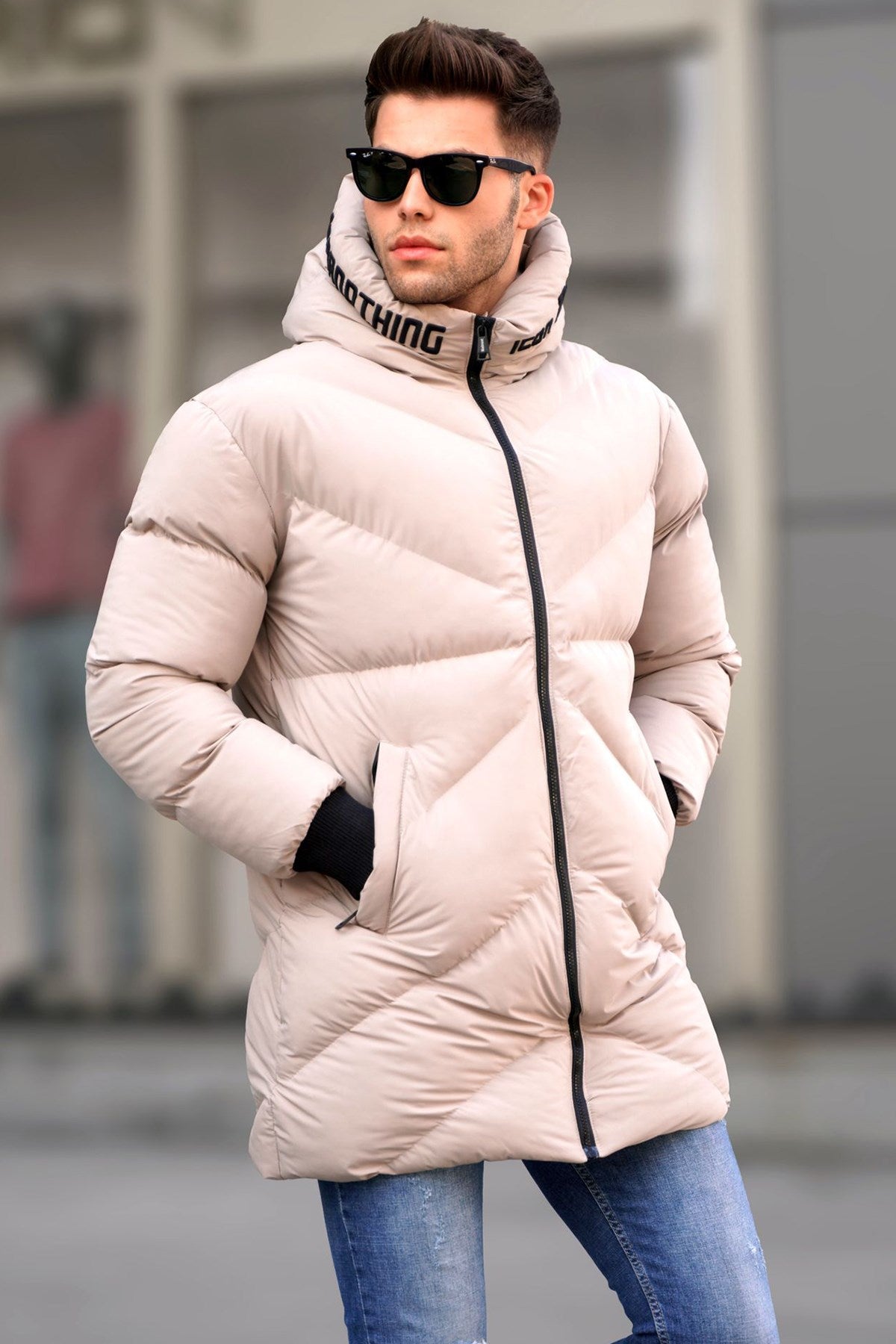 Μπουφάν πάφερ σε μπεζ χρώμα με τελείωμα κάτω από τη μέση.